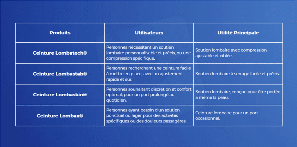 Le choix de la ceinture dépend du type de douleur et de l’usage prévu. Une ceinture lombaire est idéale pour le soulagement d'une douleur aiguë, tandis qu'une ceinture de posture est plus adaptée pour corriger les mauvaises habitudes posturales. N'hésitez pas à demander conseil à nos experts.