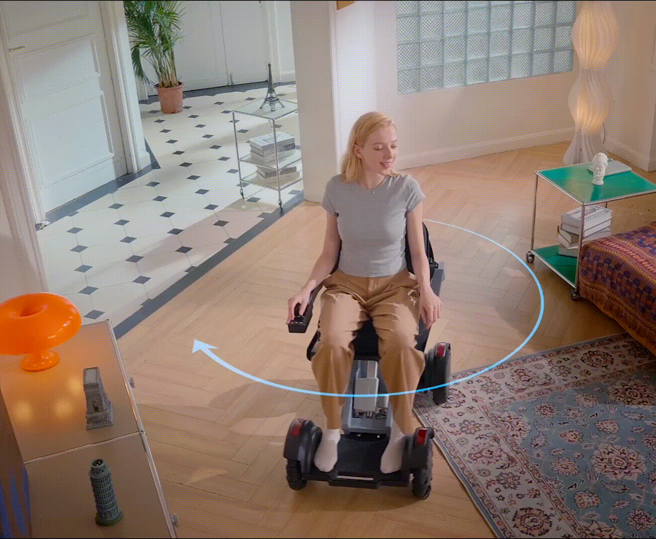 - Auto-équilibrage intelligent : Le fauteuil ajuste en temps réel l’inclinaison du siège pour maintenir une posture stable et sécurisée, même en montée, en descente ou sur terrain irrégulier.