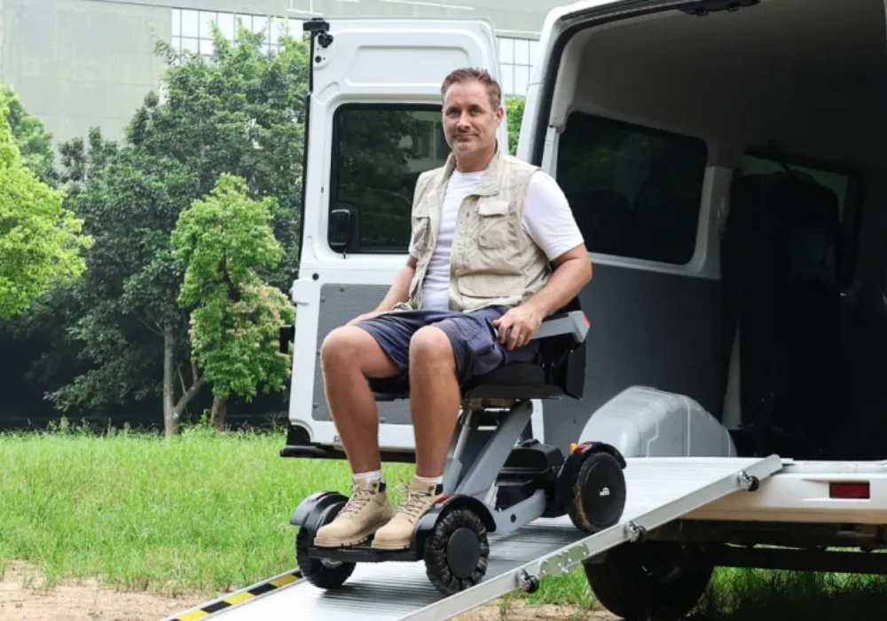 Le fauteuil se plie rapidement et peut se démonter en trois parties (châssis, siège, batterie/roues), ce qui facilite le transport, notamment dans le coffre d’une voiture.