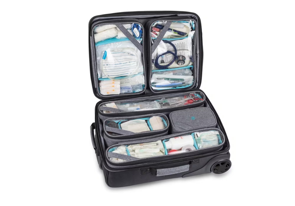 La mallette médicale trolley HOVI est conçue pour transporter et ranger le matériel médical lors des visites à domicile. Grâce à son chariot avec roues et poignée réglable, elle facilite les déplacements et réduit l’effort de transport.